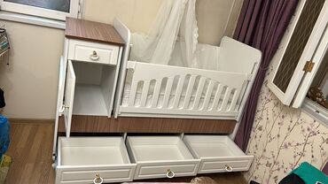 Oval və yumru formalı ağ uşaq beşiyi komplekt Uşaq yatağı az yatılıb yay qış üzlü matras(tək matras 170 AZN alınmışdı)üzərində 2 prostinya 2 ədəd yastıq yataq qırağı hörük və chikko firmasınnan fı...