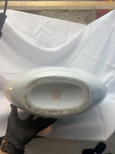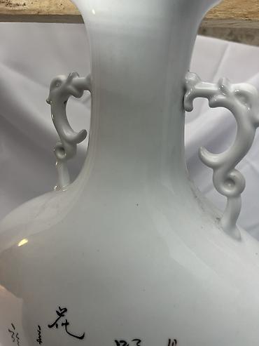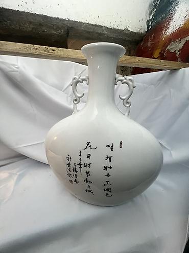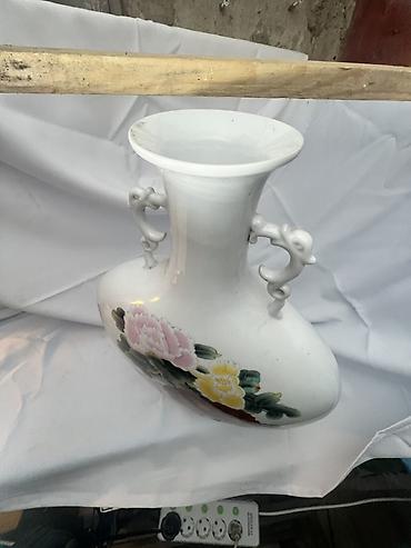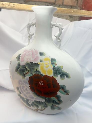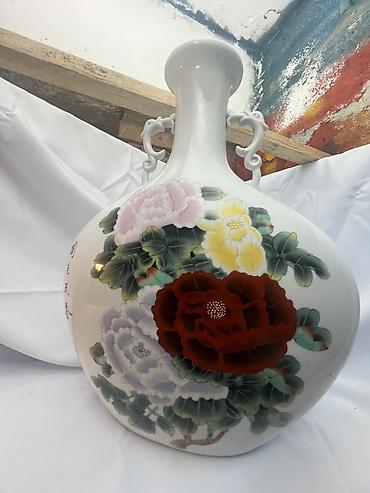 Böyük dekorativ porselen vaza - Material: cilalı ağ porselen - Forma: enli kürəvi gövdə, ensiz uzun boyun, geniş kənarlı ağız - Bəzək: əl işi üslubunda çoxrəngli rəsmlər və qara xəttlə yazılmış Çi...