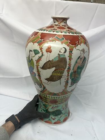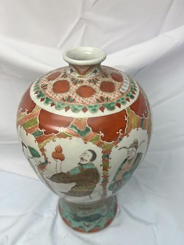 Böyük dekorativ porselen vaza - Material: cilalı ağ porselen - Forma: enli kürəvi gövdə, ensiz uzun boyun, geniş kənarlı ağız - Bəzək: əl işi üslubunda çoxrəngli rəsmlər və qara xəttlə yazılmış Çi...