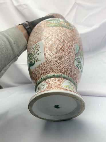 Çini vaza – əl işi, çoxrəngli dekor “Da Qing Qianlong Nian Zhi” - Material: yüksək keyfiyyətli çini, şirəli parlaq örtük - Forma: dar boğazlı, geniş gövdəli klassik vaza; geniş ağız hissə canlı gü...