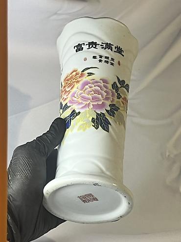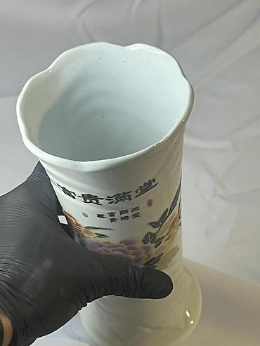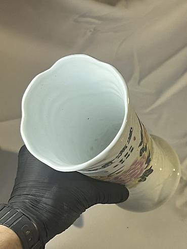 Böyük dekorativ porselen vaza - Material: cilalı ağ porselen - Forma: enli kürəvi gövdə, ensiz uzun boyun, geniş kənarlı ağız - Bəzək: əl işi üslubunda çoxrəngli rəsmlər və qara xəttlə yazılmış Çi...