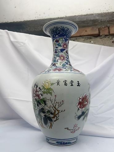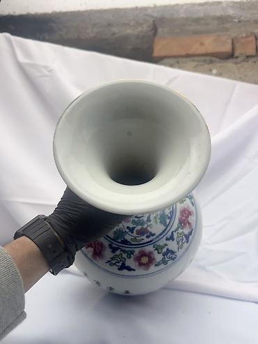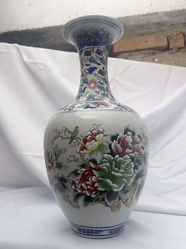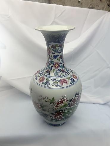 Böyük dekorativ porselen vaza - Material: cilalı ağ porselen - Forma: enli kürəvi gövdə, ensiz uzun boyun, geniş kənarlı ağız - Bəzək: əl işi üslubunda çoxrəngli rəsmlər və qara xəttlə yazılmış Çi...