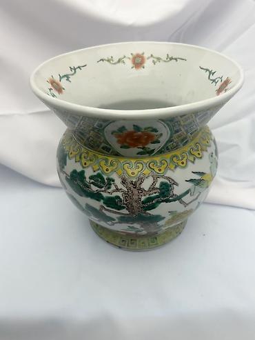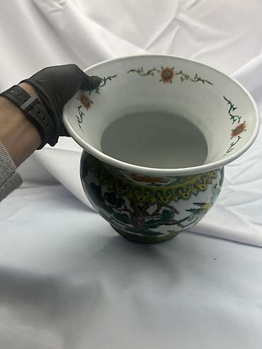 Böyük dekorativ porselen vaza - Material: cilalı ağ porselen - Forma: enli kürəvi gövdə, ensiz uzun boyun, geniş kənarlı ağız - Bəzək: əl işi üslubunda çoxrəngli rəsmlər və qara xəttlə yazılmış Çi...