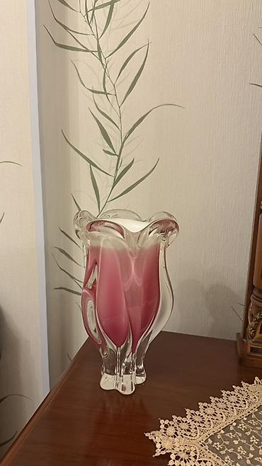 Şüşə vaza – dekorativ, əl işi görünüşlü, qalın şüşədən. - Rəng keçidi: tünd qırmızıdan açıq çəhrayıya doğru ombre effekt. - Forması: geniş ağızlı, dalğalı xətli; yanlarda xırda bəzək çıxıntılar...