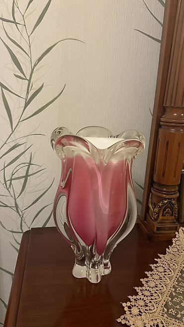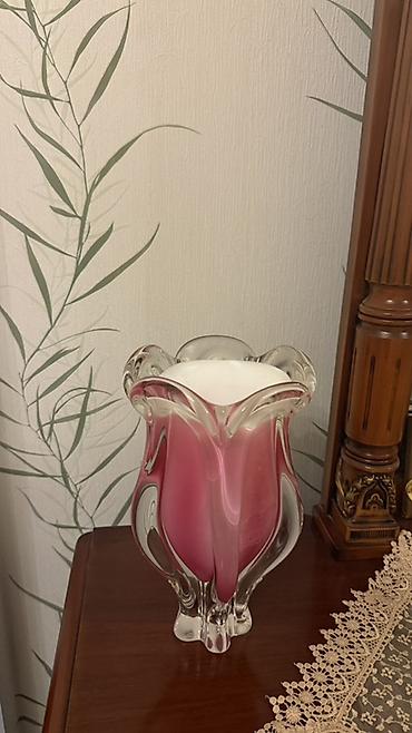 Şüşə vaza – dekorativ, əl işi görünüşlü, qalın şüşədən. - Rəng keçidi: tünd qırmızıdan açıq çəhrayıya doğru ombre effekt. - Forması: geniş ağızlı, dalğalı xətli; yanlarda xırda bəzək çıxıntılar...Giriş•Qeydiyyat