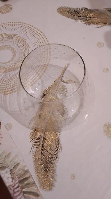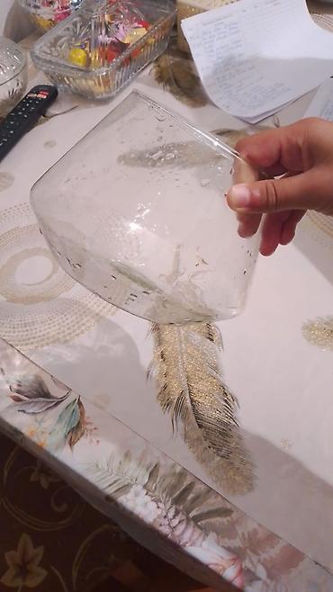 Şüşə vaza / qab - Material: şəffaf, qalın şüşə - Dizayn: yuxarı hissəsi genişlənən konus formalı, dairəvi sabit əsas; hamar, cilalanmış kənarlar - Ölçü (təxmini): hündürlük 20–25 sm, yuxarı diamet...