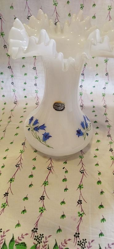 Ağ şüşədən dekorativ vaza - Material: parlaq ağ şüşə (opaqlı) - Dizayn: yuxarı hissəsi büzməli/dalğalı kənarlı klassik formalı boyun - Bəzək: gövdənin hər iki tərəfində incə bənövşəyi-mavi çiçək n...