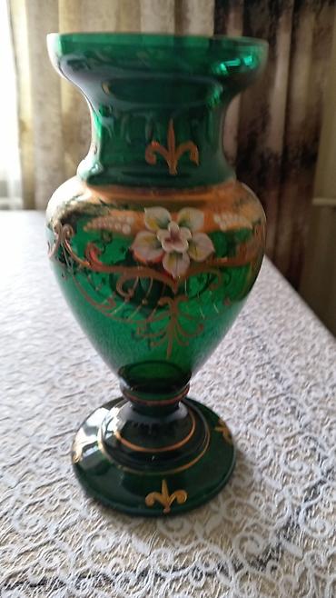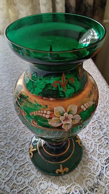 Yaşıl şüşədən hazırlanmış dekorativ vaza - Material: qalın yaşıl şüşə - Üst üzərində qızılı rəngli bəzəklər və relyef naxışlar - Əllə çəkilmiş çiçək motivləri (ağ, sarı və yaşıl tonlarda) - Aşağı ...