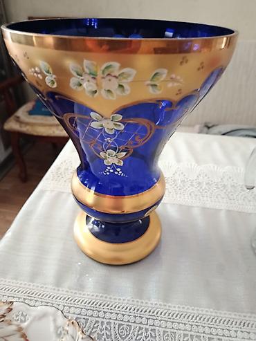 Büllur dekorativ vaza - Material: qalın şüşə/büllur - Rəng: kobalt mavi əsas, qızılı naxışlar - Bəzək: əl işi çiçək rəsmləri və qızılı ornamentlər - Forma: klassik, ayarlı boyun və genişlənən ağız...