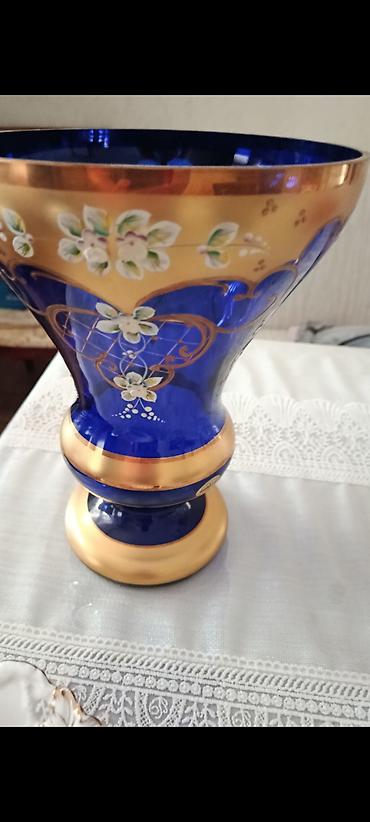 Guldan satilir 15 azn unvan çapayev vusqa2Kobalt mavi şüşədən dekorativ vaza - Material: qalın kobalt mavi şüşə - Bəzək: qızılı rəngli zolaqlar və ornamentlər, əl işi çiçək naxışları (ağ-yaşıl ləç...