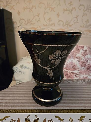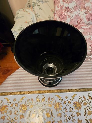Hündür dekorativ vaza - Material: parlaq qara şüşə - Dizayn: gövdə boyunca gümüşü rəngli relyef bəzəklər - Forma: enli, dalğalı ağızlı üst hissə; dəyirmi, ağır dib (stabil dayanır) - Təyinat: otaq...