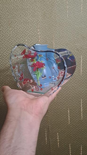 Ürək formalı şüşə dekorativ vaza. Şəffaf və mavi rəngli şüşədən hazırlanmışdır, üzərində qırmızı kəpənəklər və çiçək motivləri ilə bəzədilmişdir. Həm evin daxili dizaynına zəriflik qatır, həm də kiçik gül dəstələri üçün ideal bir yer təmin edir. Masaüstü və ya rəf dekorasiyası üçün uyğundur.