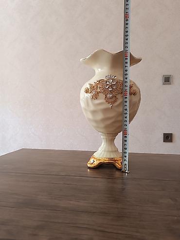 Böyük dekorativ vaza – klassik üslub - Material: keramika/porşelen korpus, metal tipli qızılı tonlarda bəzəklər - Rənglər: krem və qızılı əsas tonlar, göy və yaşıl çalarlarla əl işi rəsmlər - Diza...