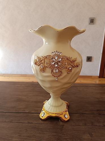 Porselen dekorativ vaza - Hündürlük: 26 sm - Qiymət: 150 AZN (şəkildə göstərilib) Təsvir: - Klassik üslubda, krem rəngli porselen gövdə - Ön tərəfdə qızılı güllü naxış - Kənarlarında əl işi kimi ...