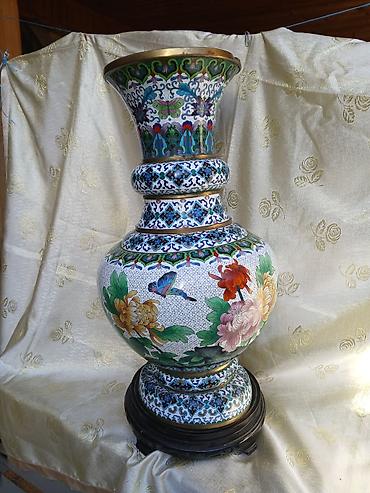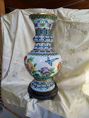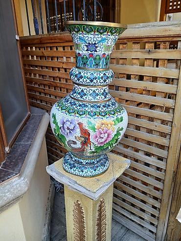 Böyük dekorativ cloisonné vazası - Material: Mis əsaslı, emal (cloisonné) işləmə, üst kənarda pirinç haşiyə - Rənglər və naxış: Əl işi emal naxışları, çoxrəngli çiçəklər (pəonia və s.), quş və kəp...