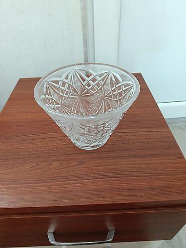 Şüşə/kristal vaza - Material: şəffaf şüşə (kristal effektli), qalın divarlı - Dizayn: dərin kəsimli ornamentlər, prizmatik və romb naxışlı tekstura; işığı yaxşı sındıraraq parıltı yaradır - Forma:...