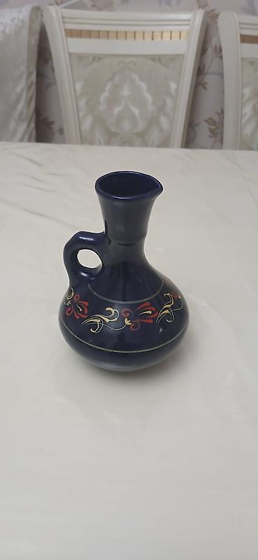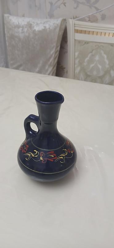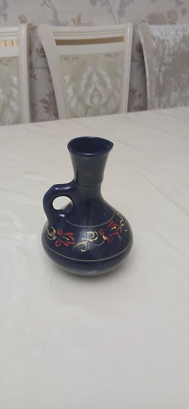 Mavi keramik dekorativ qab - Material: Keyfiyyətli keramika, parlaq qlazur örtük - Rəng: Dərin kobalt-mavi - Bəzək: Əl işi qızılı naxışlar və incə çiçək motivləri; boğaz hissəsində qızılı zolaq və...