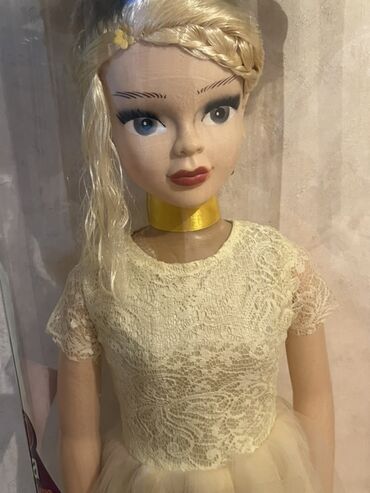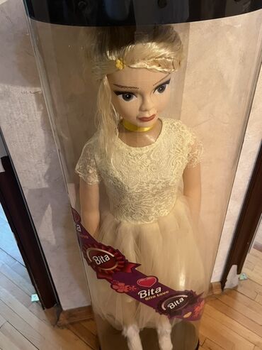 - Materiallar: plastik/kompozit gövdə, sintetik saç; krujeva detallı krem rəngli üst və tül ətəkli paltar