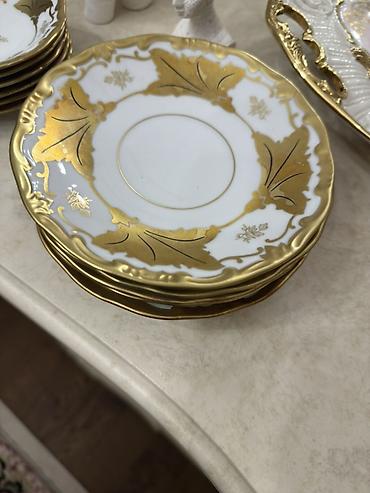 - Klassik ağ porselen üzərində qalın qızılı dekor: yarpaq ornamentləri, qızılı haşiyə və relyefli kənarlar.