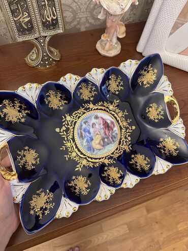 Mavi-qızılı 4 bölməli servis qabı - Material: keramik/porcelan tipli, parlaq kobalt-mavi rəng - Dekor: üzərində qızılı güllər və naxışlar, kənarlarda qızılı kontur - Forma: yarpaq siluetli, tutaca...