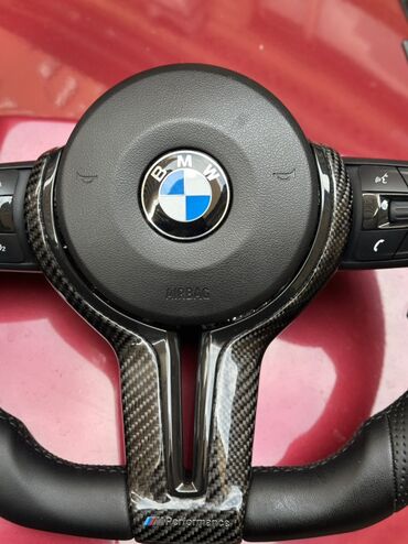 Qeyd: Rəng — qara dəri və parlaq karbon aksentləri, BMW loqosu və “M Performance” nişanı ilə. Airbag yeri mövcuddur. Paddle shifterlər komplektdə görünür.