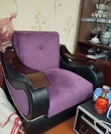 Divan və kreslo dəsti - Rəng: bənövşəyi oturacaq və söykənəcək, qara korpus və geniş taxta qolçaqlar - Üslub: klassik-modern kombinasiya; dekorativ düyməli söykənəcəklər - Material: yumşaq məxməri...