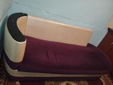 - Material: bənövşəyi məxməri/parça oturacaq və uzanma hissəsi; krem rəngli teksturalı yan və arxa hissələr; yuxarı küncdə qara parlaq dekorativ/istifadə rəfi.