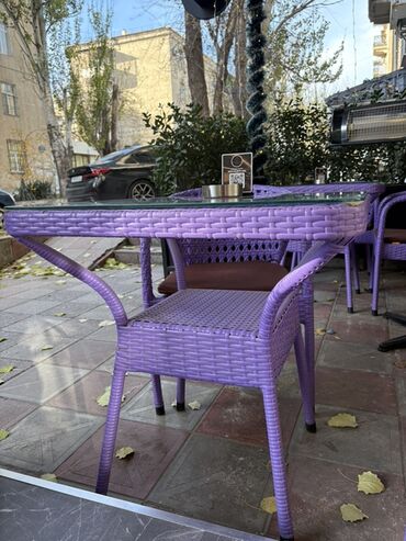 Məhsul: Açıq hava üçün bənövşəyi rəngli rattan stul və şüşə üstlü stol dəsti