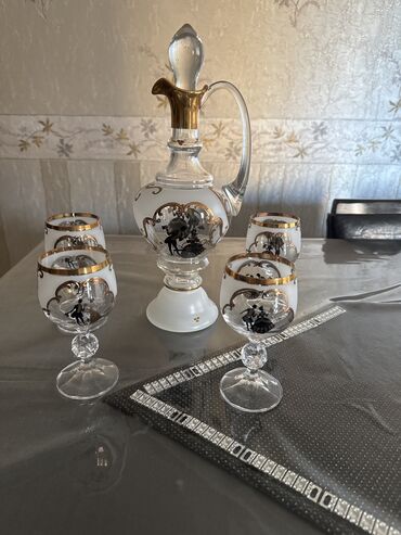 Qrafin desti. 5 stekanla. Konyaçniy dest. Mat üzerinde qizili işlemelerle. Qrafinin hundurluyu 18 sm, stopkasinin hundurluyu 6 sm. Kocurul deye coxlu sayda metbex levazimatlari, qab-qacaq, deyer-de...