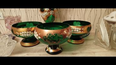 Bohema üslubunda şüşə/kristal qab-qacaq dəsti - Kase: dairəvi naxışlı şüşə-kristal kasalar. Ölçü: orta ölçü, salat və ya şirniyyat üçün uyğundur. Qiymət: 1 ədəd – 30 AZN (şəkildə 2 ədəd göstərilib...