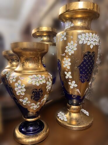 Bohemia şüşəsindən dekorativ vaza dəsti (2 ədəd) - Material: Bohemia şüşəsi - Üslub: Qızılı rəngli örtük və əl işçiliyi dekor – relyefli naxışlar, üçölçülü çiçək kompozisiyaları, incə mirvarı nöqt...
