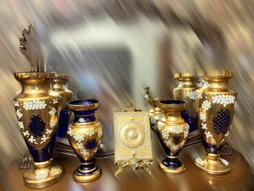 4 ədəd Bogema Qab dəsti hissəsi. Bu dəstə iki ədəd hündür vaza və iki ədəd alçaq qab daxildir. Hər bir əşya zəngin göy rəngdə olub, qızılı detallar və ağ çiçək naxışları ilə bəzədilmişdir. Qızılı r...