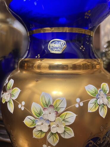 Məhsul: Boyalı bohema vaza - Material: qalın kobalt-mavi şüşə - Dizayn: əllə çəkilmiş qızılı ornamentlər və 3D effektli çiçək naxışları - Rənglər: kobalt-mavi əsas, mat və parlaq qızılı haşiyələr,...