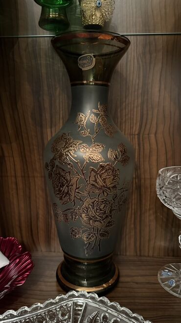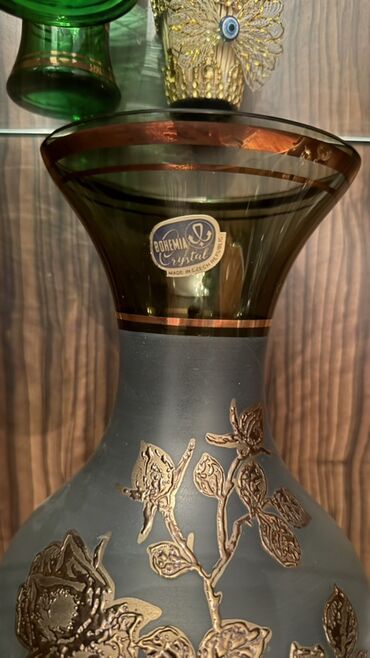 Bohоmiya üslubunda dekorativ şüşə vaza - Material: qalın keyfiyyətli şüşə - Rənglər: parlaq qızılı örtük, tünd yaşıl və qara tonlar - Bəzək: əl işi kimi görünən relyef çiçək naxışları, yaşıl medal...
