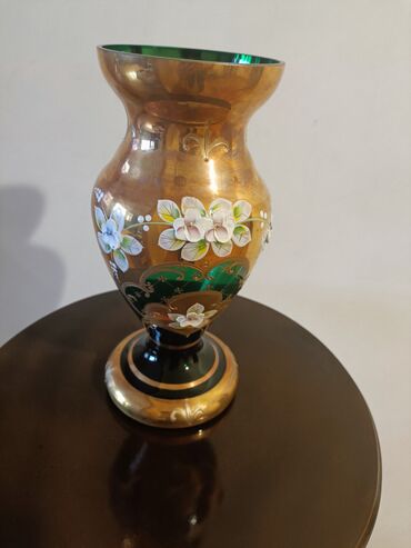 Şüşə dekorativ vaza - Material: qalın, keyfiyyətli şüşə - Rəng: zümrüd-yaşıl əsas, qızılı metallik haşiyələr və bəzəklər - Dizayn: əl işi kimi görünən relyef naxışlar, qızılı fonda çiçək motivləri...