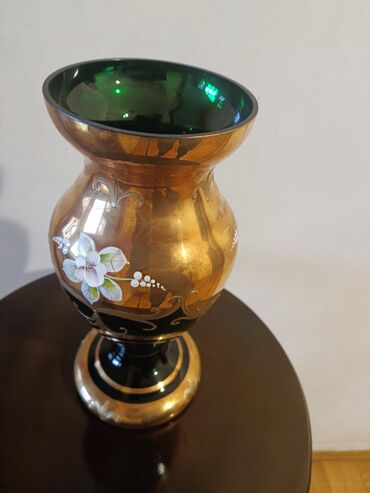 Bohоmiya üslubunda dekorativ şüşə vaza - Material: qalın keyfiyyətli şüşə - Rənglər: parlaq qızılı örtük, tünd yaşıl və qara tonlar - Bəzək: əl işi kimi görünən relyef çiçək naxışları, yaşıl medal...