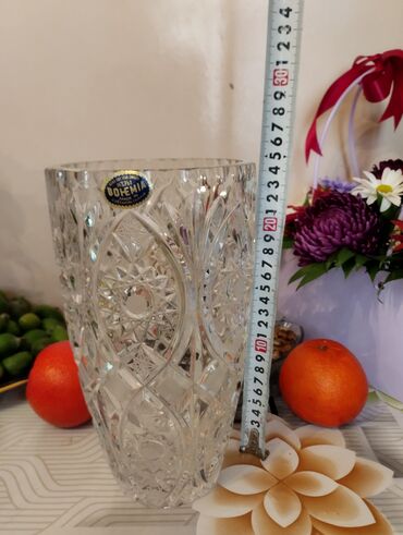- Vaza: Orijinal BOHEMIA kristalı, üstündə istehsalçı etiketli. Dərin kəsimli naxışlar, yüksək parıltı. Ölçü lentindən göründüyü kimi təxmini hündürlük 30 sm. Geniş ağızlı, güllər üçün ideal.