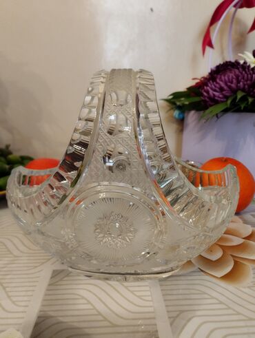 - Səbət qab: Eyni üslubda kəsme kristal, qalın divarlı. Yan və tutacaq hissəsində büllur naxışlar, günəşşəkilli ornamentlər. Meyvə, konfet və ya dekor üçün uyğundur.
