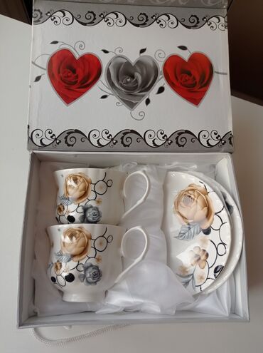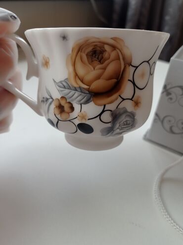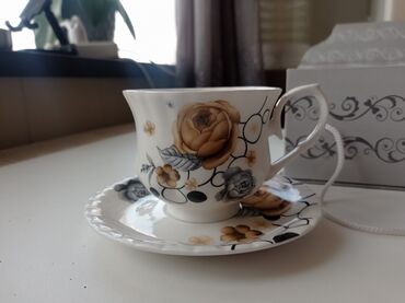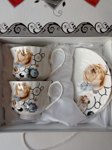 Məhsul: Çay/qəhvə dəstləri 1) Porçelan fincan-nəlbəki dəsti - Ağımtıl fonda pastel çiçək naxışları (solğun çəhrayı yarpaq, xırda narıncı çiçəklər) - Zərif formalı qulplu fincanlar - Uyğun nəlbəki ...