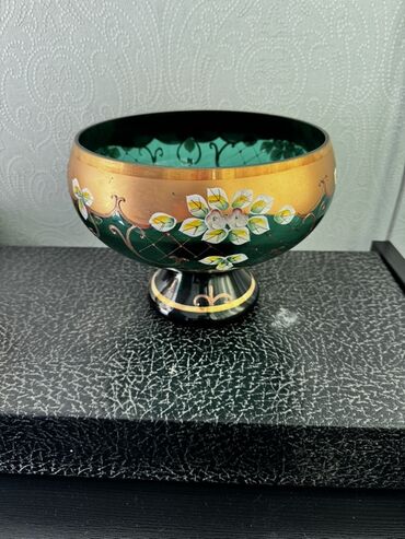 2) Yaşıl şüşə, enli ağızlı, alçaq qab – qızılı fon üzərində əl işi çiçək kompozisiyası, dekorativ qab kimi.