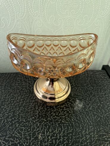3) Şaftalı rəngli press-şüşədən yarımay formalı, ayaqlı kasə – şirniyyat, qoz-fındıq və ya dekor üçün.