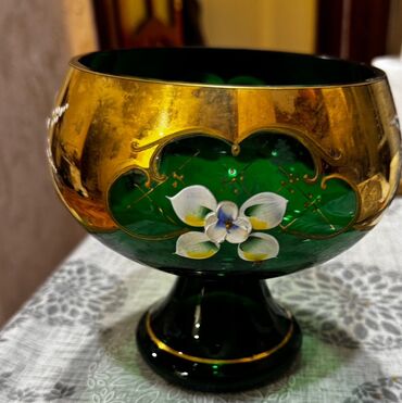 1) Yaşıl şüşədən hündür ayaqlı böyük meyvə/snickers qabı – üst hissədə qızılı haşiyə və əl çəkimi çiçək ornamentləri.