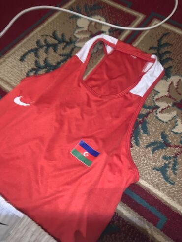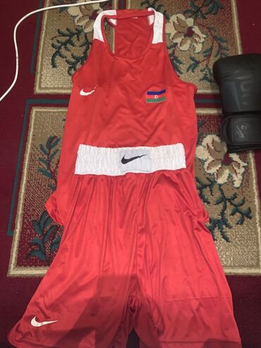 - Qırmızı rəngdə boks forması: atlet və şort. Atletin ön hissəsində Azərbaycan bayrağı, sinədə Nike loqosu, şortun bel hissəsində elastik ağ kəmər və Nike işarəsi var. Yüngül, nəfəsalan parça, məşq və yarışlar üçün rahat kəsim.