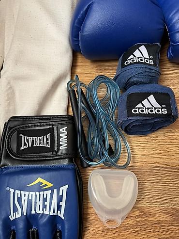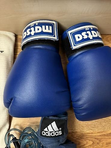 - Matsa məşqləri və sparrinqlər üçün mavi rəngli boks əlcəkləri (8–10 oz tipli, Velcro bağlama)