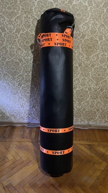 Boks üçün asqılı zərbə çantası. - Material: xarici səth möhkəm sintetik dəri/rezin tipli örtük - Rəng: qara, narıncı “SPORT” yazılı kəmər və asqı qayışları - Forma: silindrik - Asqı sistemi: üst h...