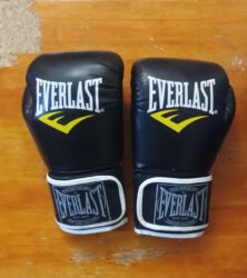 - Boks əlcəkləri: Everlast markalı, qara rəng, Velcro (skarç) bağlama ilə biləyi möhkəm saxlayır. Zərbəni yumşaldan yastıqlama və havalandırma üçün perforasiya.