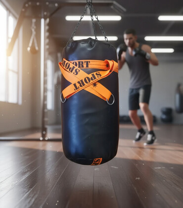 - Boks kisəsi: qara rəngdə, kompakt ölçülü, asma üçün portağal rəngli “SPORT” qayışları və metal halqalar. Evdə məşq və cardio üçün uyğundur, asılması rahatdır.