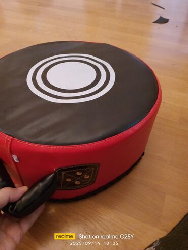 - Dəyirmi zərbə yastığı (focus pad/striking pad): Qırmızı-qara rəngli, üstündə nəzərlənmə üçün ağ dairəvi hədəf çapı. Yan tərəfdə tutacaq qayışı var, kənarları sapla bərkidilmişdir. Diz, qol və təpik zərbələrinin texniki məşqi üçün uyğundur.