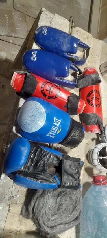 - Boks əlcəkləri: Everlast brendi, mavi-qara rəngdə, bilək bağlamalı model. Yastıqlanma qalın, yumruq və bilək üçün yaxşı dəstək verir.