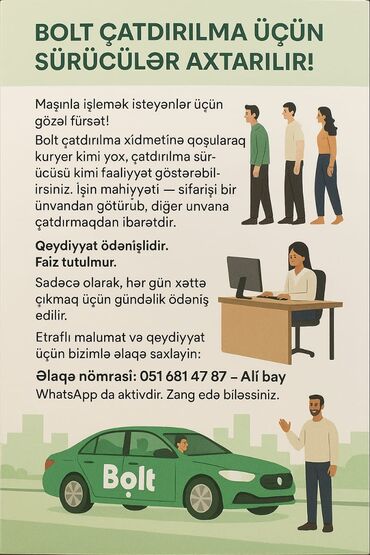 Öz siman və öz maşının qeyd olunaraq bolt çatdırılma hesabı açılır bolt drive proqramının içində açıb verilir kategoriya açılır çıx işlədə nə dəyanmısan.